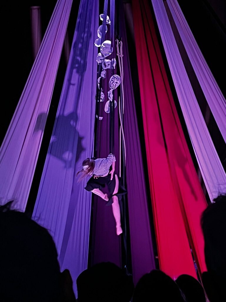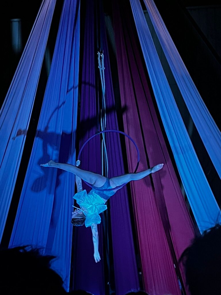 Pour accompagner les numéros, j’ai imaginé un environnement qui reprend le langage du chapiteau de cirque. Ces toiles tendues recentrent l’attention des spectateur.ices sur les performances des artistes et elles permettent d’être un support à leurs ombres.